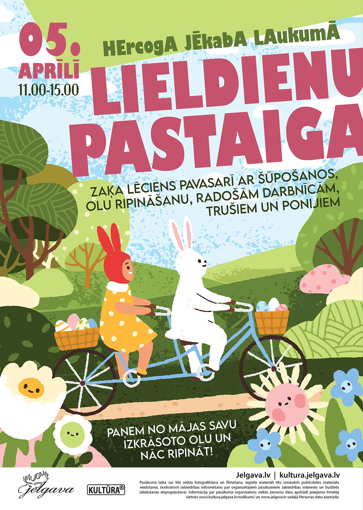 5. aprīlī no pulksten 11.00 līdz 15.00 Jelgavā, Hercoga Jēkaba laukumā, notiks ikgadējā “Lieldienu pastaiga”, kur visas dienas garumā apmeklētājus priecēs koncerti, jautras rotaļas un daudzveidīgas svētku aktivitātes.