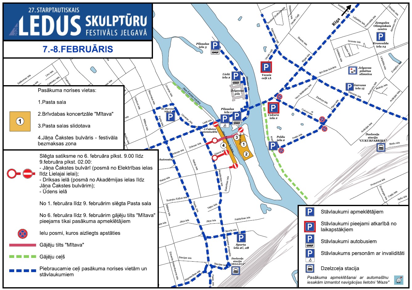 In preparation for the event, traffic restrictions are planned in the city – from February 1, Pasta Island will be closed to visitors, leaving access to the public skating rink, children's playground and restaurant "Pilsētas elpa", and from February 5, for safety reasons, the children's playground and skating rink area will also be restricted during construction, leaving access to the restaurant. During the creation of the sculptures and various technical works, from February 6 at 9 a.m. to February 9 at 2 a.m., traffic will be closed on Jāņa Čakstes Boulevard between Elektrības Street and Lielā Street, on Driksas Street between Akadēmijas Street and Jāņa Čakstes Boulevard, as well as on Ūdens Street.